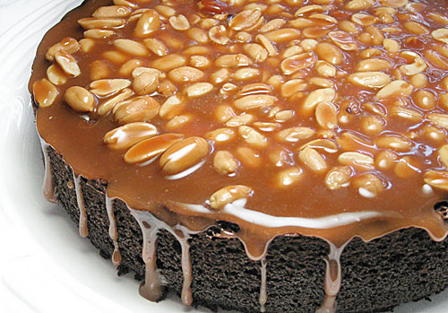 Caramel-Peanut Topped Brownie Cake. Once you remove the first slice, an avalanche of sticky gooey crunchy goodness slides in to fill the gap. And it is HARD not to grab a spoon and start cleaning the plate a little. OK, a lot. You know what would take this completely over the top? Splitting the chocolate cake horizontally and adding a layer of marshmallow fluff. THAT’S the kind of thinking that makes my dad proud.