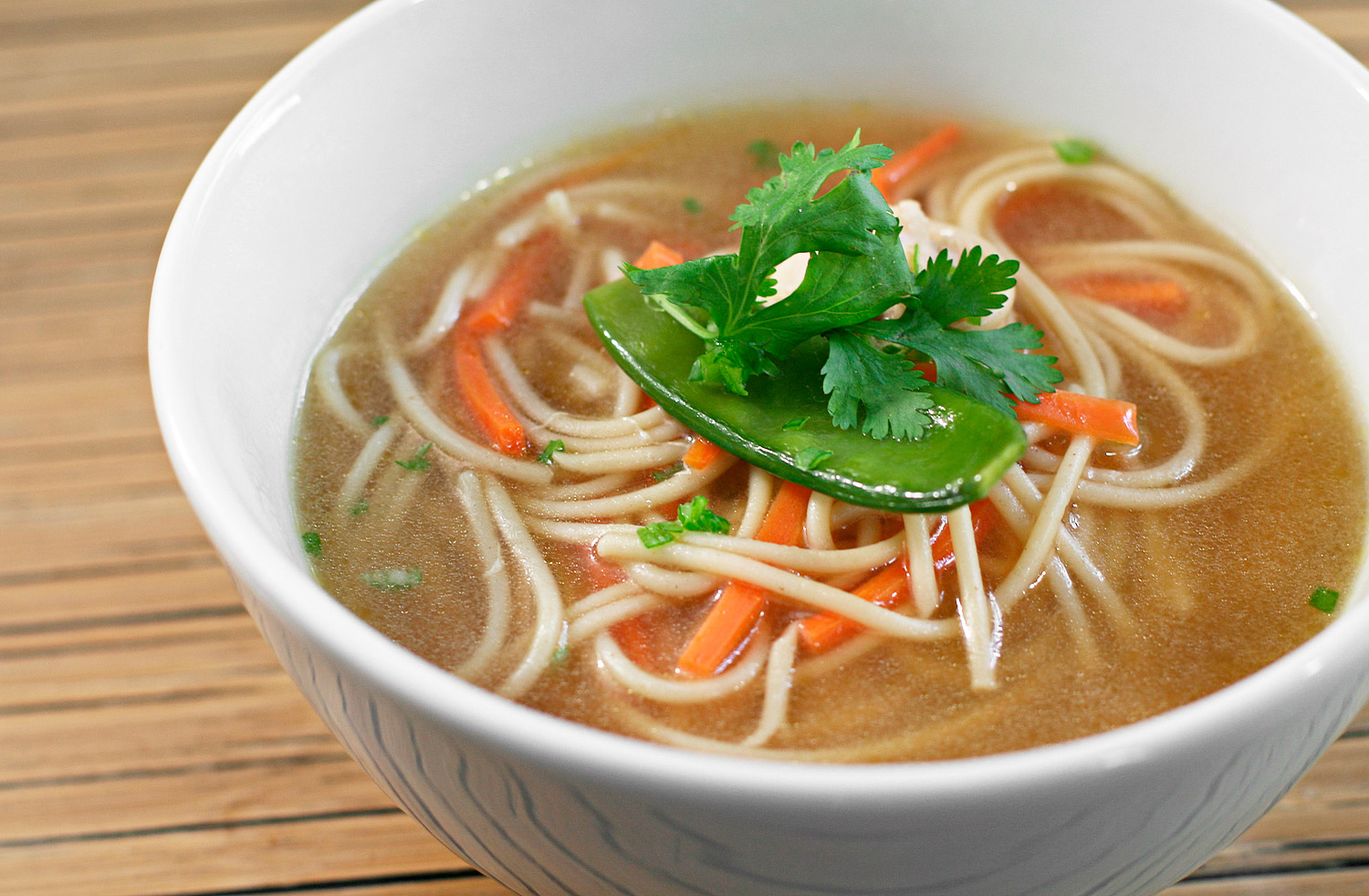 - Using a pair of tongs, gently lift the noodles out of the broth, and transfer them to your soup bowls. Ladle the hot soup over the noodles. Garnish with scallions, parsley, and cilantro, and serve immediately.