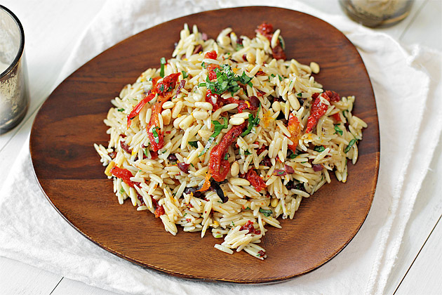 This Mediterranean Orzo Salad reminds me of those nights, because it’s the sort of salad that begs to be taken on a picnic. Three cups of orzo (a rice-shaped pasta) mixed with sweet sun-dried tomatoes, meaty Kalamata olives and toasted pine nuts. It’s delicious, filling, imminently packable, and it seems sophisticated without trying too hard.