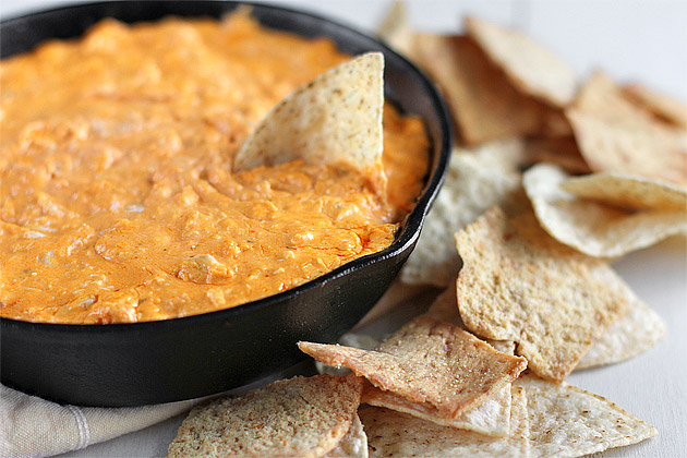 I’m not a big fan of Buffalo wings – something about that mountain of wittle bones gives me the cweeps – but this dip is different. It comes out of the oven all melted and gooey, with little streams of hot sauce on top. It’s so thick, it’ll cling to your chip without dripping, and every bite sings with Frank’s hot sauce, blue cheese and lots of shredded chicken.