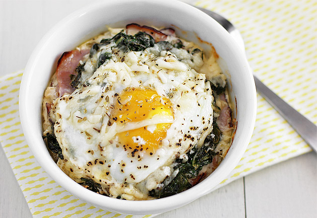 It’s a Southern breakfast-in-a-bowl – a fluffy mattress of creamy grits, topped with thin sheets of Black Forest ham, greens sautéed in olive oil and thyme, a light blanket of cheese and a pillowy baked egg speckled with black pepper.