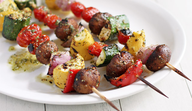 Farm-Stand Grilled Vegetable Skewers with Pesto Vinaigrette