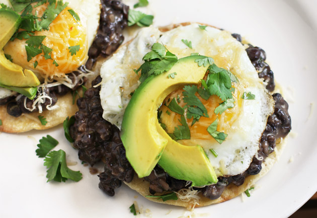 - To Assemble the Tostadas: Top each tortilla with about 1/4 cup of the bean mash and 1 egg. Then evenly divide the cheese, avocado slices, and cilantro among your tostadas. Serve garnished with a slice of lime and hot sauce to taste.