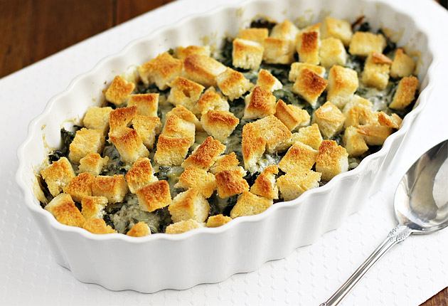 I didn’t want to eat the kale, but I didn’t want to waste it, either, so I started looking for comfort foods with kale and found this Crispy Baked Kale with Gruyère: sauteed greens covered in a blanket of melted cheese and crunchy sourdough croutons.