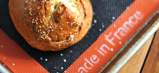 Recently Demarle, the company that makes Silpats, sent me a new one to check out, as well as something I’d never seen: a Silpain Perforated Baking Mat for baking bread and bready things, like pizza, dinner rolls, pretzels, biscuits and croissants. I tested it out on the pretzel rolls, and the perforations let air reach the bottoms of the rolls, so they got nice and crusty instead of damp.