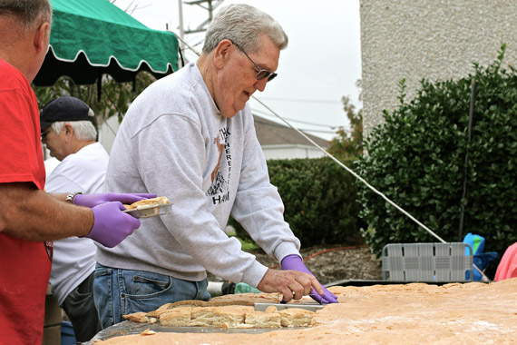 I was wondering how they were going to split that mammoth biscuit when three men gathered around it with custom grid-patterned cutters and made quick work of turning the one big biscuit into hundreds of small ones. Those biscuits were split, stuffed and sold as quickly as they were made.