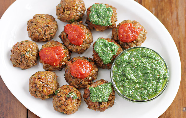 Meatless Monday: Veggie Balls with Spinach-Basil Pesto