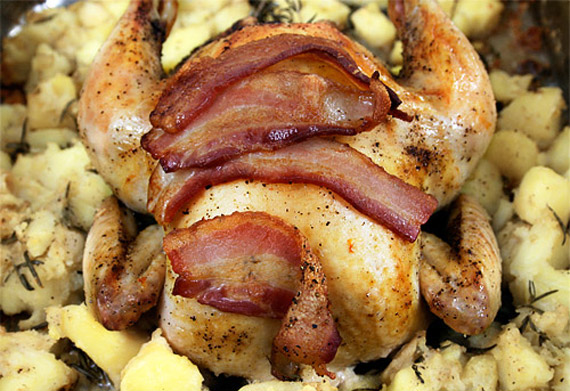 - Transfer the chicken to a cutting board, and let it rest for 10 to 15 minutes. Remove the bacon slices from the chicken, and crumble the bacon over the potatoes.