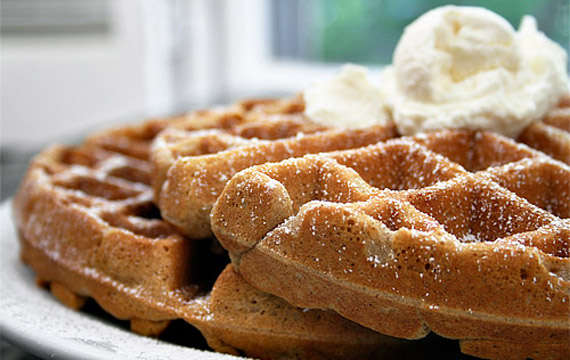 - Dust the waffles with confectioner’s sugar, and top with Vanilla Whipped Cream. Serve hot off the iron or warm from the oven.