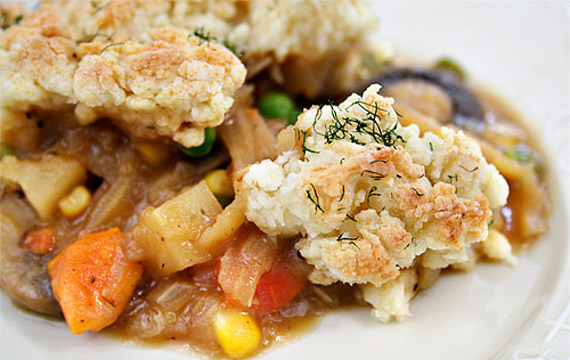 - Drop the biscuit batter over the vegetables in the dish in six equal mounds. Sprinkle the dill over the dough.